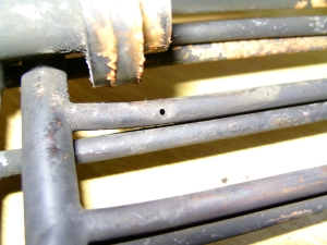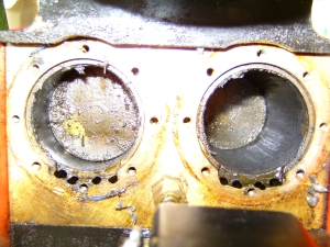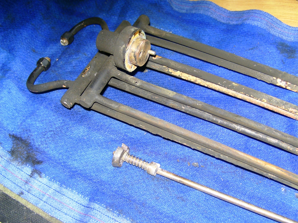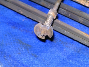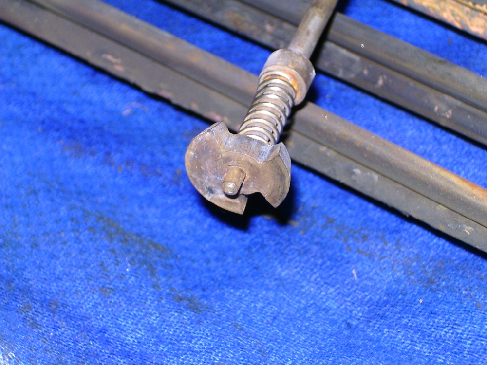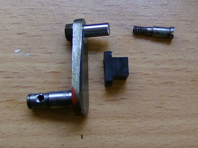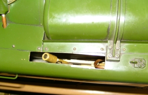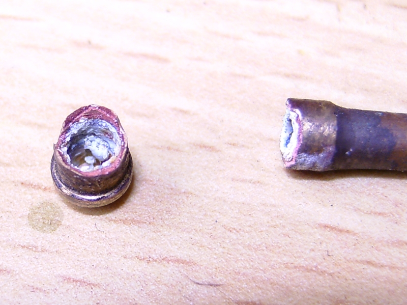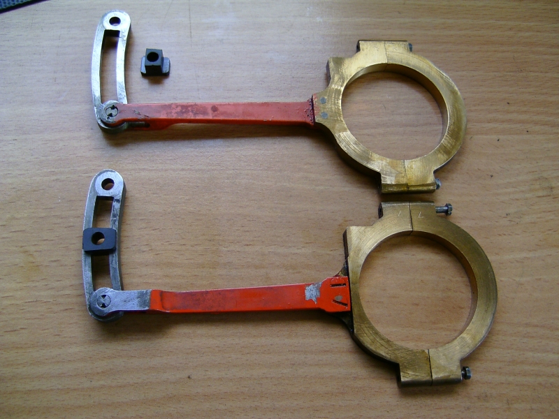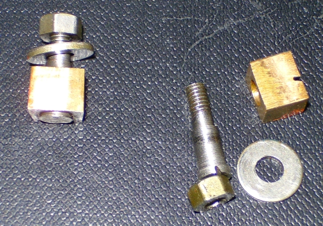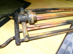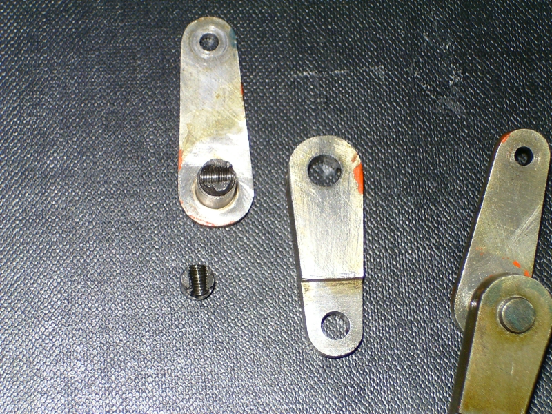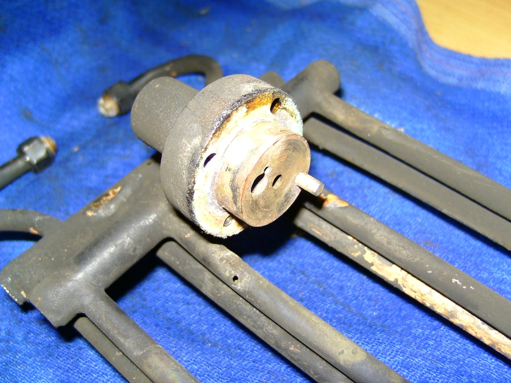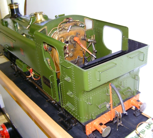 21/05/2010 This belongs to a fellow club member who had it professionally built many years ago. The workmanship is top notch and the platework is absolutely stunning. The chassis appears to be based on LBSC's Pansy design but the topworks are obviously different. It's not had a run for several years but John the owner has brought it down to the track a few times recently and tried unsuccessfully to get steam up and give it a run. It has however run very well in the past. Several people have had a go with it with the same lack of success. It's possible to get the boiler pressure up to about 50psi with an electric blower but as soon as the loco's own blower is used, the pressure rapidly falls again. This could be the fault of the blower or an air leak in the smokebox etc. As usual, I took pity on him and offered to take the loco home and see if I could find the problem. The first thing was to connect up the compressor and put some air into the boiler. I pumped it up to about 30psi and was greeted by the sound of air escaping from several sources! The most obvious leak was from the gauge glass which leaked at both the top and bottom fittings. I had helped John fit a new glass recently when we found that the gauge was reading very erratically, making it difficult to tell whether the boiler had any water in it or not! It transpired that the original glass was too long and was blocking the hole through to the boiler in the top fitting. The new glass did leak a bit but I assumed this had been sorted. Obviously not. It turns out that the nuts for tightening the seals (slices of silicon rubber tubing) were too long and the threads were bottoming before tightening down on the seals. A quick skim in the lathe to shorten them soon sorted that out and the glass was refitted with no leaks. Next leak was the injector steam valve which was cured by taking out the spindle and recutting the conical end in the lathe. I noticed that a pool of water was gradually flooding the bench top and this was traced to the blowdown valve leaking. The spindle on this seemed very tight so I decided to unscrew the complete top of the valve (after draining the boiler!). This promptly sheared off at the thread that screws into the valve body! A few choice words followed! Although the body of the blowdown valve seemed to be bronze, the top fitting was made from brass and the threaded part had corroded away due to dezincification. The stainless valve spindle had also virtually seized into the brass fitting. Fortunately, it proved easy to unscrew the blowdown body from the boiler but I was surprised to see that the valve seemed to screw straight into the boiler backhead without a proper bush? In order to unscrew the valve I had to remove a short copper drain pipe on the bottom of the valve body and the nipple on that snapped straight off due to the same problem - dezincification of the brass. Dezincification of a brass pipe nipple A new top for the valve was quickly turned up and the threads in the body cleaned up as well as the threads on the spindle. The valve was then refitted, as good as new. It also sealed this time! That seemed to cure all the leaks on the outside of the boiler except for a slight leak from the whistle valve which I wasn't too bothered about. There was, however, air coming out of the blast pipe which meant the regulator was leaking when shut. I had noticed when John had tried to steam the loco at the club, there seemed to be steam coming from the chimney, even when the blower was turned off. The valves on this loco (as on Pansy) are underneath the cylinders so they fall off the port face when there is no pressure in the steamchest. The leak from the regulator wasn't enough to seat the valves so the air was going straight up the exhaust. I decided to see if I could sort this leak out as it was quite serious but where was the regulator? Pansy has a dome with the regulator inside that, but the 94XX doesn't. It turns out the regulator is a horrible disc in tube type situated between the superheater header and the bush on the front tubeplate. This meant removing the superheaters to get at it. Hmmm. It turned out to be not that difficult in the end. The steam boss on the header was only held on by 4 screws and the connections to the cylinder were nut and nipple joints. It was a tight squeeze as the wet and dry headers would only just fit through the hole in the smokebox door ring but I got the lot out eventually. The port face of the regulator just bolts between the boiler bush and the steam pipe boss and the disc has a slot in it to uncover the holes in the port face. The disc is operated by a long stainless steel rod with a square on the end and a spring to keep the disc against the port face. Very simple but, as is often stated, a devil of a job to get to seal properly. Superheaters with disc type regulator (Can you spot the obvious that I completely missed somehow?) The port face and the surface of the disc were a bit scuffed and the disc had stuck onto the square on the end of the operating shaft so the spring was not actually doing it's job. The disc was removed from the shaft and the square hole eased with a needle file to stop it sticking again. The face was then lapped flat by rubbing it on fine carborundum paper on a surface plate. The port face was also lapped flat by the same process after removing the stop pin that limits the rotation of the disc. The whole lot was then reassembled and refitted to the boiler with a bit of steam oil on things to lubricate it for now. Refitting the regulator and the superheaters was quite fun as several times the disc came off the end of the rod just as I was getting it into final position and it took a few attempts to finally get it all back! I would imagine it was originally fitted to the boiler before the boiler was fitted to the smokebox. Another air test showed the regulator to be sealing ok now but on opening the regulator there was a lot of air still coming o