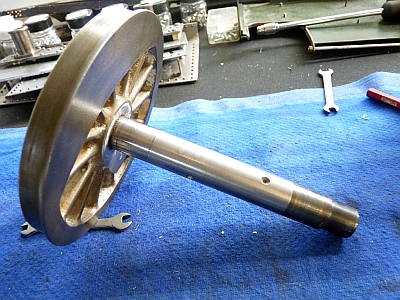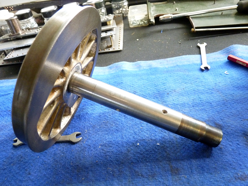 Setting the strap to run truly was fun as the bore was now oval rather than round but I managed to get it pretty close using a dial indicator. It was a case of get the front and rear surfaces of the bore centralised on the lathe axis and then the top and bottom. You also have to be very careful not to grip the strap too tightly otherwise you will distort it. Small cuts with a very sharp boring tool was the way to go to avoid moving the strap. I wasn't sure how well this would turn out as the original bore was quite badly tapered but it came out much better than I expected with the 'new' bore covering about three quarters of the surface. There were just two small areas at the top and bottom of the strap adjacent to the bosses that didn't clean up but there is very little load on these areas so no real problem. Most of the work is done by the front and rear surfaces of the bore. The last two eccentric straps went smoothly as the bores were nice and parallel and only required a skim off the bolting faces like the first one. I made them all a little tight to begin with and then bedded them in on the lathe as for the first one. I'm not quite sure what material these straps are made from but they do look like gunmetal castings and not brass. I've just dashed out to the workshop in the pouring rain (hang on, it's June - it should be summer!!) and measured the throw of the eccentrics. It's slightly under 0.5" which is far too small. It should be 0.625" for Firefly and even more to suit the oversize ports! It also looks as though the eccentrics have been set at 180° apart and at 90° to the cranks so there is no angle of advance. Everything is completely wrong! Who on earth designed this valve gear? I've got real problems now. The position of the eccentrics obviously needs to be altered but they are pinned to the axle and the ends of the pins are recessed in the eccentrics so can't be got out without drilling them out. Even if I get the pins out the eccentric throw is still wrong and the only cure for that is new eccentrics. I think this would mean larger diameter eccentrics which would mean new eccentric straps as well! What a *@#&* mess! 02/06/2015 I've had a better look at the eccentrics this morning. They are not at 180° after all but the angles between them and the crankpins seem purely random! (I looked at the angles by using the very scientific way of screwing taps into the grub screw holes and looking at the angles of those!). I assumed initially that the eccentrics would have been set by a pre drilled dimple or something in the axle for the securing grub screw to locate in (like the Polly kit locos) but it looks as though these have been set by hand and obviously completely wrong. Unless, of course, they were set up wrong from the factory? I don't have access to the building instructions for the Prairie which would have been useful. Actually, having just looked again, the eccentrics seem to be drilled all the way through and fitted with taper pins so it should be possible to knock the pins out with a punch. This doesn't help the fact that the eccentric throws are too small but at least I might be able to move the eccentrics. Just been out in the workshop and I managed to get the pins out of the eccentrics. They had been Loctited in so I had to heat everything up to release them. The pins are just parallel ones and not tapered, probably the reason they had been Loctited. The grub screws do go into predrilled holes and I reckon that was possibly done at the factory. The dimples are larger in diameter than the threaded hole for the eccentric grub screws so they must have been drilled before the eccentrics were fitted and not afterwards. Maybe the axle came with the eccentrics already fitted? One of the wheels are going to have to come off the axle so I can remove the eccentrics. More heat required! What I'm thinking of now is to try and increase the throw of the eccentrics to the same as on Firefly (0.625") and then make new valves to suit. It won't matter that the ports won't open fully to steam as they are wider than they should be anyway. The centre of the axle is actually larger in diameter than the journals so I can reduce that down to the journal size which will mean the eccentrics can have a smaller bore through them which will help if I am going to increase the throw. I don't particularly want to make a new axle as it has keyways cut at the ends for quartering the driving wheels and I don't want to faff around cutting those. The eccentrics could be replaced but as I've made the straps a good fit on them now it would be a shame to scrap them. I can Loctite a plug into the existing bores and then rebore them to give the increased throw. That will be quicker than making new eccentrics from scratch anyway. This jobs taking more time than it should do as it is! 03/06/2015 I managed to get one wheel off the driving axle using heat to break the Loctite bond and then I could remove the eccentrics. I left the other wheel on as it didn't really need to come off and would give something to drive the axle when I machined it. The axle was mounted between centres and I adapted a spare chuck backplate by drilling a hole in it to match the crankpin on the remaining wheel. This backplate has been used several times before for machining wheels etc. It had plenty of holes in it already but, of course, none in the right place for this job! Before this I Loctited some lengths of steel bar into the pin holes in the axle, just to fill up the holes and make it easier to drill new ones if I decide to refit the pins through the eccentrics As mentioned above, the centre of the axle is larger in diameter than the journals so it was turned down to a thou or two larger than the journal diameter.