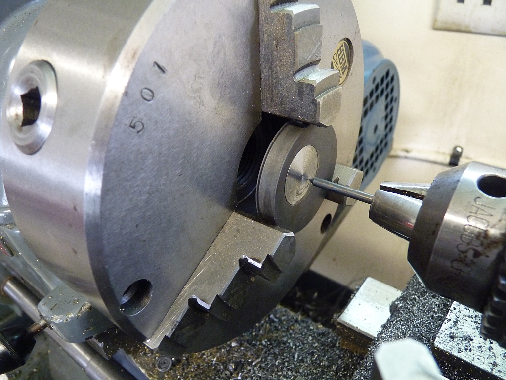 To mark out the position of the new bore I first needed to find the centre of the eccentric. I did this by holding the eccentric in my most accurate 3 jaw chuck and then spotting the centre using a piece of silver steel with a machined point on the end (it should be plenty accurate enough for this job). You just use it like a centre drill but it only makes a tiny indentation. Actually, it's the tool I use for centring injector cone blanks when drilling them. Conventional centre drills are much too big for this job.