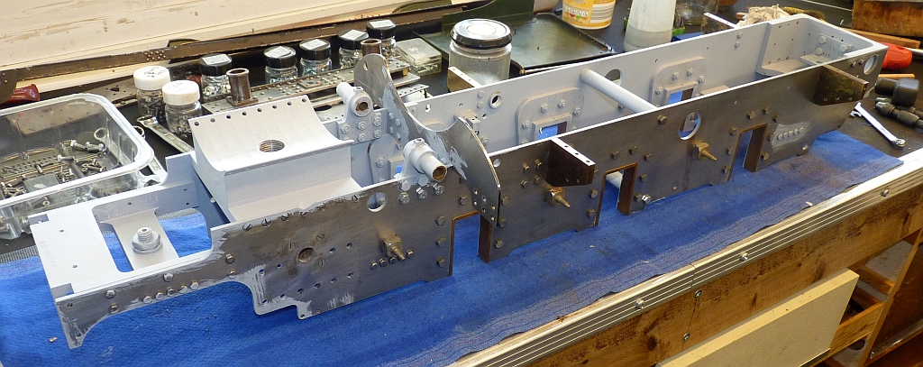 The front buffer beam is ok but I replaced the rivets holding on the buffer stocks with bolts which looks much better. The stocks are in two parts, the barrel and the square mounting plate, held together with a bit of threaded tube. The threads on these tubes were badly mangled so they were replaced. The steps on the stocks had been glued on any old how so I refixed those with soft solder paste. It's a shame that the kits used such enormous rivets on the beams as they look grossly out of scale but that's not my problem.