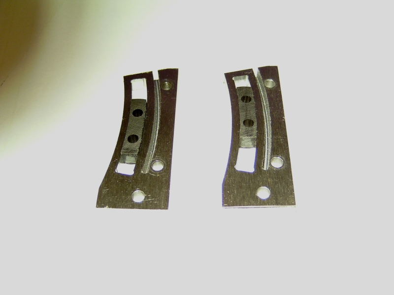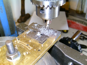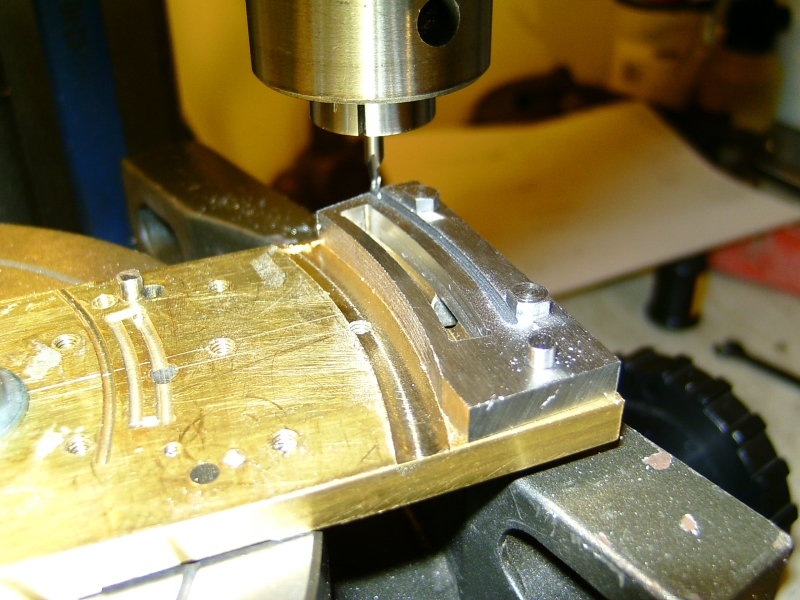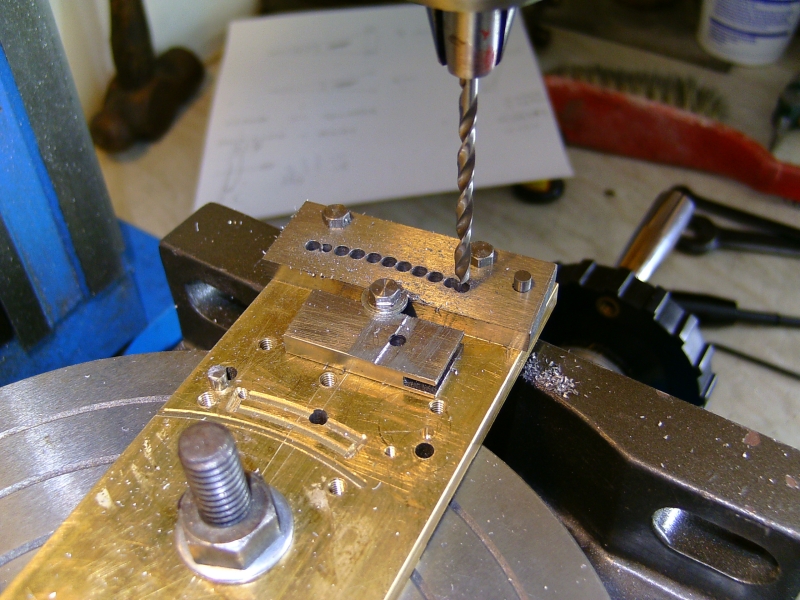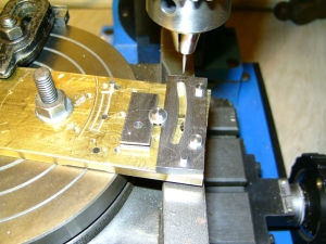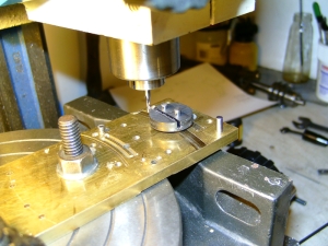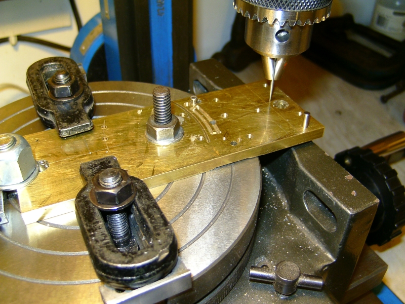 06/03/2010 Another job for my brother's S15! He doesn't have a rotary table so I said I would part machine the expansion links for him. The links are cut from 3/16" thick gauge plate and I machined the slots by mounting the blanks on the rotary table using the length of brass plate that I keep for this operation. It's getting a bit tatty and hole riddled now so may have to be replaced soon! The first job was to mark a centreline down the plate and mark off the centre of the radius and then the centreline of the curved slot scribed with dividers. The centres were then lightly centre popped to give a reference point. Next the position of the hole in the tail of the link was marked out and drilled and reamed to take a silver steel pin to accurately locate each blank. Two blanks were then cut from the gauge plate and drilled and reamed for the hole in the tail and also two more holes along the rear edge for 5BA bolts to fasten the blanks to the plate. The blanks were drilled together as a pair so that the holes would be identical in each one. One of the blanks was then fitted onto the locating pin in the plate, clamped in position and the two mounting holes spotted through onto the plate. These were then drilled and tapped to take the bolts. After centreing the rotary table on the milling machine (using a centre in the table and a needle in the mill chuck), the plate was bolted to the table using the needle in the chuck to line up the centre pop on the plate with the centre of the table. The table was then wound across until the needle aligned with the line scribed where the centre of the slot in the link would be. The dial on the leadscrew was then zeroed so that it could be returned to the centre when necessary. This also made it easy to move the table an equal amount either side of the centre point to produce a slot of the correct width and with edges equally spaced either side of the centreline. Lining up the axis of the mill with the centre of the slot to be machined One of the blanks was bolted onto the jig and a series of 1/8" holes drilled along the centre of the slot using the index collar of the table to space them equally, firstly using a centre drill and then an ordinary drill. Centre drilling the holes for the slot Drilling the holes The holes were next milled out with a 1/8" carbide endmill to form a continuous slot which was then finished slightly undersize. Slot milled but not yet to width The 1/8" endmill was replaced with a 1/16" diameter and the slot carefully cleaned up to final size. This is where you need to concentrate as it's very easy to turn the table the wrong way and take a bit out that you don't want to! I cheated and wrote it down on a bit of paper to keep reminding myself which way to turn the table handle! When the slot was finished I went back and widened it slightly at the top and bottom to get rid of the rounded corner to the slot. You can of course file the corners square but it's as easy to do it this way. It's just to allow the die block to go right to the ends of the slot. My brother was going to shape the outside of the links by hand but I thought that while the blanks were set up I may as well mill the front edge to shape and also partly mill the rear edge, just leaving the easy bits for him to do. The front edge was done with a 1/4" carbide mill but the rear edge was done with the 1/16" to leave the part with the fixing bolts in place. Rough shaping the blanks That was the links finished as far as I was concerned so the next job was the die blocks. I made these from my favourite material, bearing grade PEEK, as it seems to wear well and is dead easy to machine. Two blanks were parted off a length of bar and the faces cleaned up on carborundum paper. The rod used allowed two die blocks to be machined from each blank so this would make one die block plus a spare for each link. As it happened, each slot in the links were exactly the same width and I could have got away with using just one blank. The fact the slots were identical was more by luck than judgement! I didn't expect them to be the same. The brass plate was drilled and reamed for two more 1/8" diameter pins spaced 3/8" apart and the PEEK blanks treated the same. The two holes were spaced using the rotary table again to ensure that each blank would fit onto the two pins in the plate. The blanks were then pushed onto the pins and roughly cut to shape using the 1/16" endmill. They were then very carefully skimmed down to a good push fit into the slots in the links. You have to be careful here to keep the hole in the link central in the die block and not to one side. I make the blocks a good push fit to begin with and after they are cut to shape, carefully fit them by easing them with a fine file until they will slide nicely up and down the slot but still a little tight to allow for bedding in Cutting the blanks to shape 'Finished' links and die blocks My brother can cut the die blocks to final size. Don't want to do everything for him!
