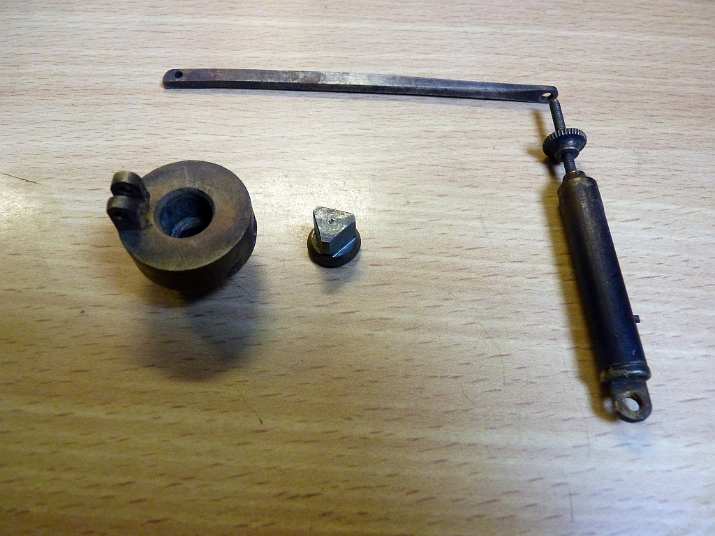 There is no makers name as such on the gauge, just a trade mark and a symbol. It also only reads to 80psi so I suspect that the working pressure of the loco when it first ran was probably fairly low, perhaps only 50 or 60psi? The gauge is unusual in that it has a large diameter flange on the bottom that bolts to a similar flange with a threaded boss on it for the steam connection. The number on the top of the dial is 632720 so they must have made a lot of them! I was a bit confused at first by the fact that the tender does not have a handpump fitted but amongst the bits in one of the boxes was what looked like a handpump of sorts. At first I couldn't see where it would have fitted but then spotted some mounting holes in the rear drag beam of the loco. It fits along the back of the drag beam under the cab floor and is operated by a shaft and lever sticking out the back of the drag beam at the righthand end. You can just make it out in the photos of the loco chassis. The whole loco is a lovely piece of work and deserves to be put back together and given a run so watch this space. The major job will be completing the boiler but everything is there except for the stays so the cost for materials will be minimal. However, I don't have any timescale for this. It depends on how desperate Bob is for it to be finished. I think he wants to sell it and recoup some of his losses from the job that he did. I'm tempted to make him an offer for it but I've eventually decided to buy Monstrous after the owner David has been trying to sell it me for a couple of years now! 10/03/2019 After a it of research on the internet it would appear that the pressure gauge was made by Schaffer and Budenberg although all the photos that I found show the name written on the front of the gauge. Perhaps they didn't put the name on these small gauges? The flanges at the bottom connection house a corrugated diaphragm that operates the needle via a linkage. It's difficult to date the gauge but it could be late 1800s/early 1900s.